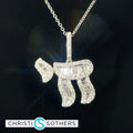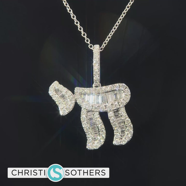 14KT White Gold Round + Baguette Diamond Chai Pendant