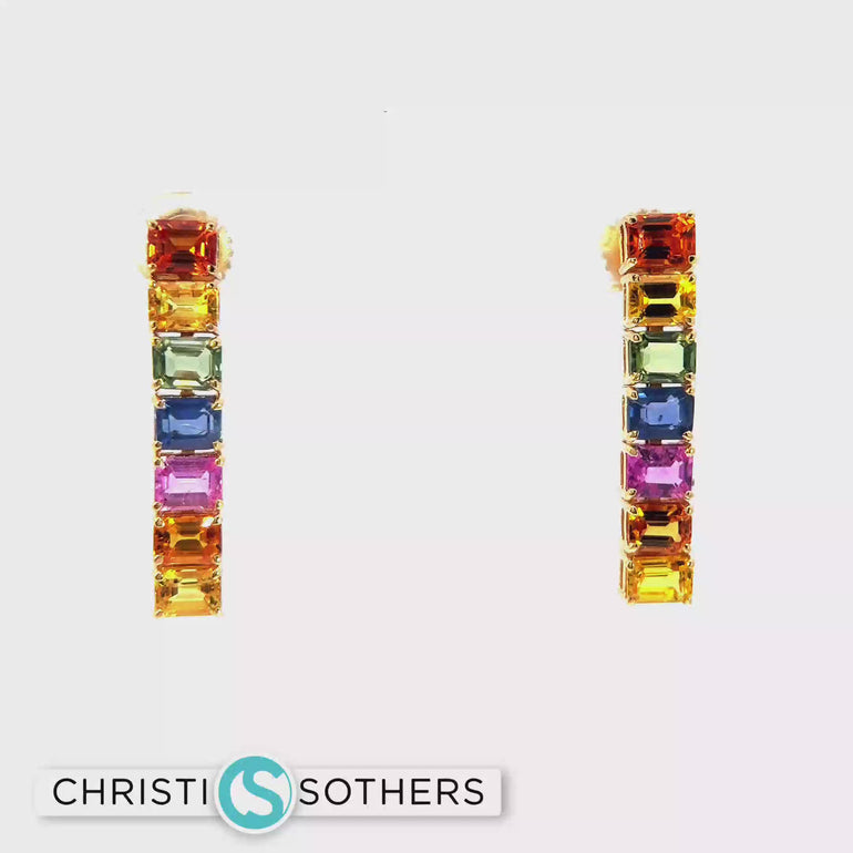 18KT Gold Dangle Earrings with Multi-Colored Emerald-Cut Sapphires